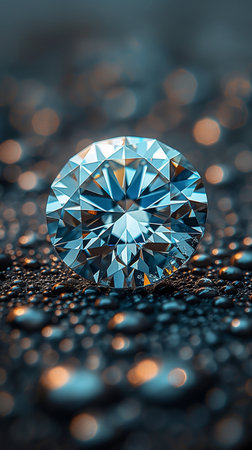 A beautifully rendered image showing a brilliant diamond resting upon a textured, sparkling surface. The sharp facets and cool blue tones provide a sense of opulence and refined elegance.