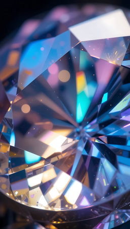Captivating macro shot showcasing the intricate facet arrangement of a gemstone. Light playfully refracts through the cut crystal, creating a mesmerizing display of colorful sparkles and a sense of elegance.