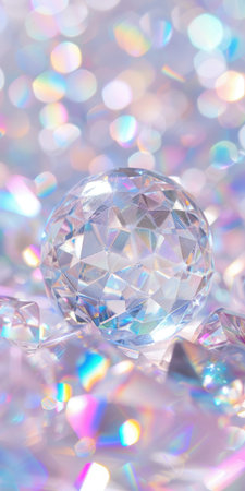Brilliant crystal sphere reflecting light amidst a vibrant bokeh background.