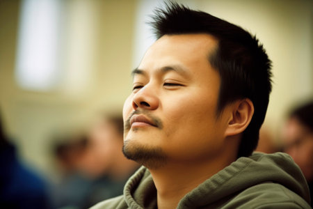 Portrait of a young asian man with eyes closed in a public place