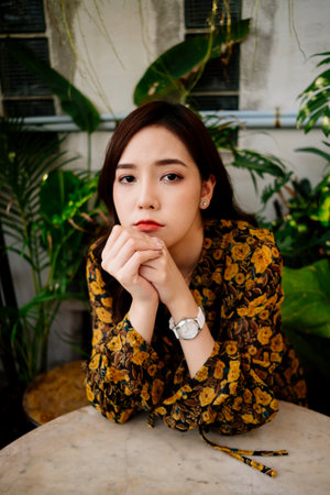 Asian woman sitting at the table in white cafe