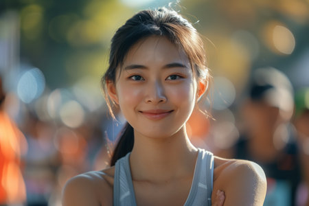 Asian female athlete smiling with confidence at a city marathon event.