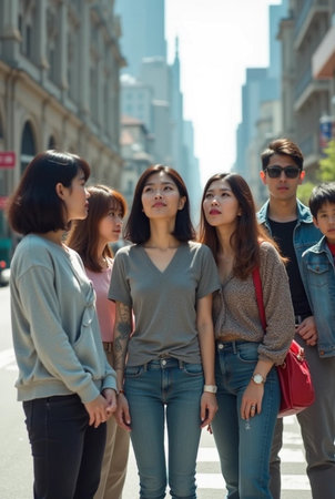 Group of young Asian people standing in the city and talking.