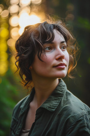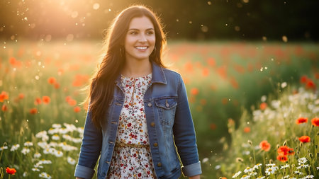 A young woman with long flowing hair enjoys a peaceful moment outdoors. The warm golden sunlight enhances her natural beauty, creating a serene and joyful atmosphere.