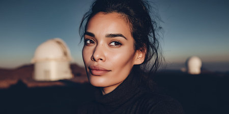 A young woman with long, dark hair looks thoughtfully into the distance against a blurred blue background.