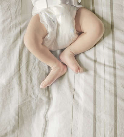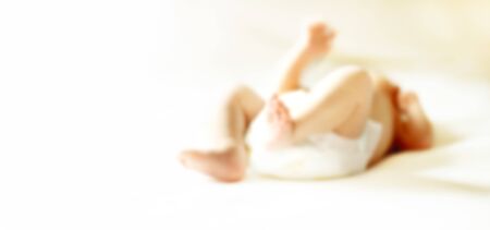 image of the legs of the baby lying on the bed. blurred image for the advertising text.
