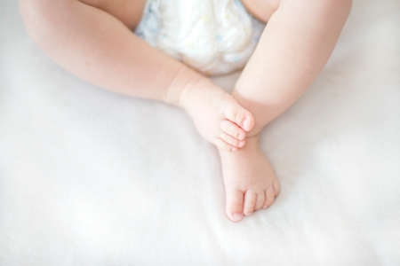 Baby legs with cloth diaper on white blanket