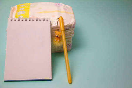 Blue nipple with carabiner and chain, yellow pen with a bear, diaper pack, notepad, preparation for the birth of a baby. isolate, copy space a gray background