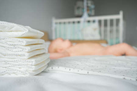 Stack of clean diapers on foreground selective focus and baby girl lying on bed white sheets at home on blurred background, closeup