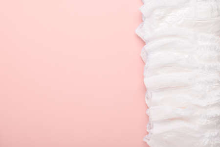 A large stack of disposable diaper panties on a pink background with a place to copy. Flat layout, top view
