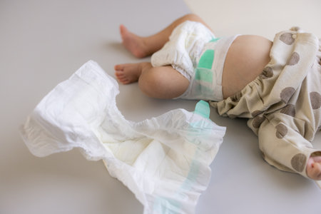 Baby in diaper lying on mat with used diaper beside