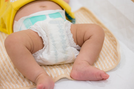 baby lying on stomach, close-up view of legs and diaper