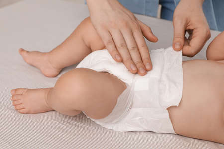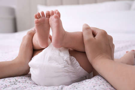 Mother changing baby's diaper on bed, closeup