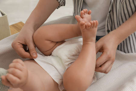 Mother changing baby's diaper on table at home, closeup