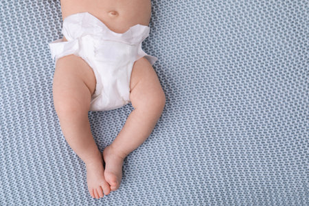 Newborn baby belly and legs in diaper, lying on white bed, top view, copy space