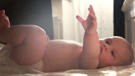 A half-year-old beautiful baby in a diaper lies on his back and looks at the camera with joyful emotions