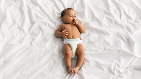 Cute little African American baby lying on bed at home