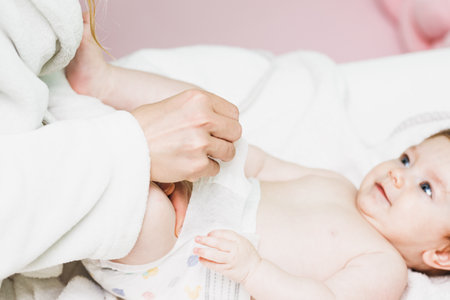 Mother putting diaper on baby in after bath in bedroom.