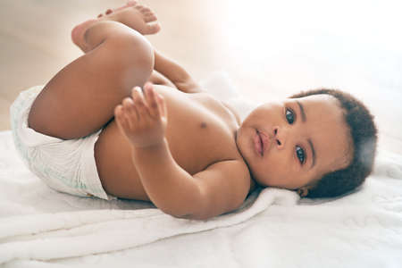 Can someone change my diaper please. Shot of an adorable baby girl at home.
