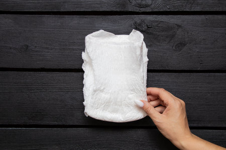 Female hand holding white disposable adult diaper pants on black wooden background, top view