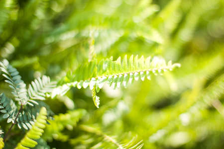Ferns. Forest plants on a sunny day in June. Close-up of a leaf on a blurred background.