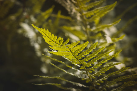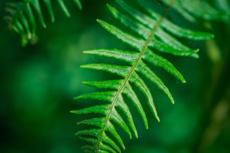 fern leaf is green with shallow depth of field. shallow depth of field on fern branches