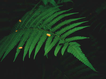 Selective focus of fern leaf isolated in dark background. Natural ferns pattern. Beautiful background made with young green fern leaves. Beautiful ferns leaves green foliage. Natural floral fern.