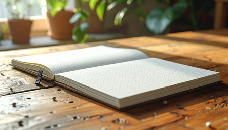 Early morning sunlight streams through the window blinds, casting linear shadows across the blank pages of an open journal.