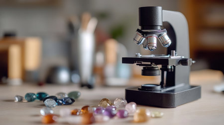 A sleek microscope stands prominently in a laboratory setting surrounded by a variety of colorful crystals and gems, perfect for scientific research and exploration.