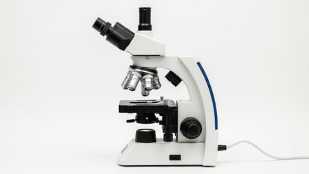 This image features an advanced laboratory microscope, designed for detailed scientific analysis. The microscope is equipped with multiple lenses and adjustment knobs, allowing for precise focusing and magnification. It is connected to a power source via a cable, indicating it may have advanced features such as illumination or digital imaging capabilities. The device is predominantly white with blue accents, suggesting a modern and professional design suitable for various scientific applications.