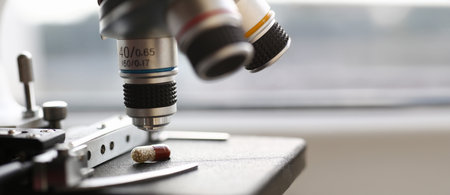 Laboratory equipment optical microscope, closeup of scientific microscope with metal lens, data analysis in the laboratory