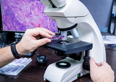 Modern microscope station with atibody-stained tissue sample image on the screen