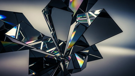 Sharp, dark geometric crystal fragments with vibrant rainbow refractions and reflections.
