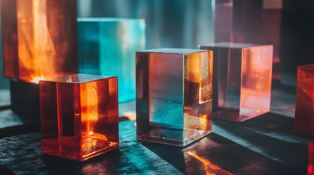 Abstract image of colorful glass blocks reflecting warm orange and cool blue light, creating a modern and artistic composition. Represents design, creativity, and contemporary art.