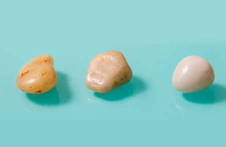 3 small brown stones, similar to pebbles, horizontally lie on a turquoise background. Blank space for text about relaxation and meditation. This is a horizontal picture with stones.