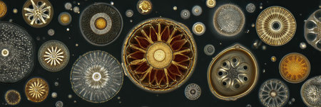 Microscopic view of actinoptychus heliopelta diatoms displaying intricate radial patterns and delicate internal structures, creating a mesmerizing display of nature's complexity at a cellular level