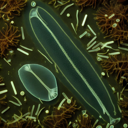 Discover a captivating microscopic world with colorful microorganisms floating gracefully in a liquid environment, showcasing intricate shapes and unique textures.