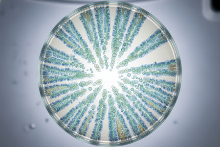 Various types of bacteria in a petri dish under a microscope, scientific medical laboratory research