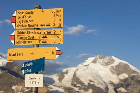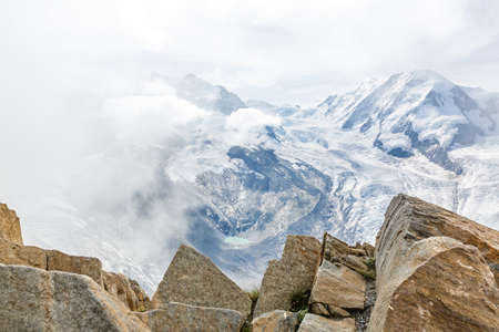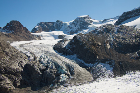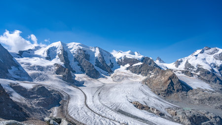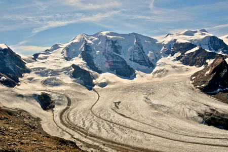 Stunning view of the Bernina massive and Morteratsch glacier at the mountain house of Diavolezza in Engadine area of Switzerland.