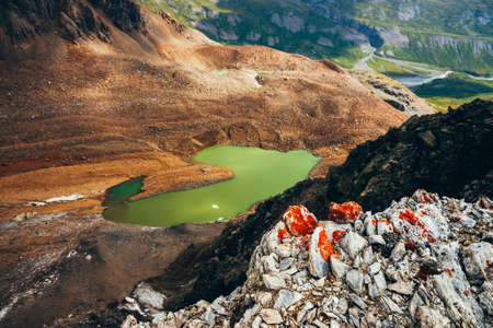 Most beautiful glacial lake of acid green color. Emerald mountain lake behind stones with orange lichens. Pieces of ice on water among rocks and stones. Awesome alpine lake of unusual green tones.