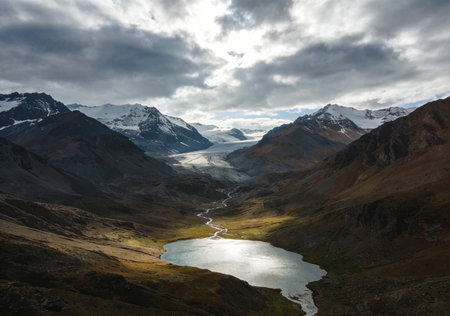 Stunning aerial view of Palu Lake below Piz Palu glacier in Swiss Alps on the way of sightseeing train Bernina Express on cloudy autumn day, Canton of Grisons, Switzerland