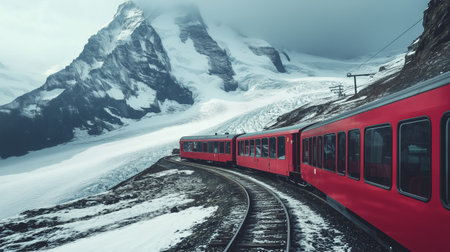 Bernina Express train, one of the highest railway in the world, goes across snowy mountain between Italy and Switzerland