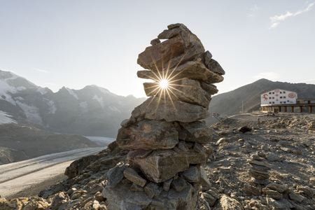 Diavolezza, Switzerland, July 31st 2017: Cairn with sunray an hotel in the background