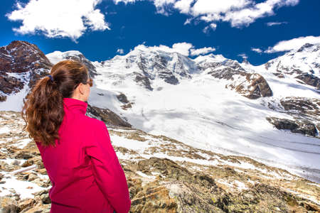 Young attractive woman enjoying the stunning view of Morteratsch glacier and Bernina Mountain range from Diavolezza near Sankt Moritz, canton Graubunden. Diavolezza is one of the ski areas of the Upper Engadin, near Sankt Moritz, Switzerland.