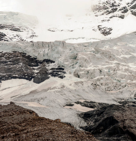 Chalaadi glacier close up in Svaneti mountains, Georgia, cloudy weather