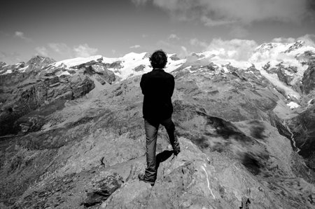 hiker at the top of a pass with backpack enjoy sunny day in Alps. Switzerland, Trek near Matterhorn mount.