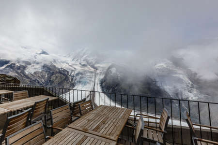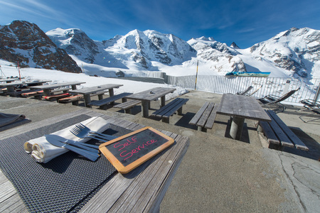 Terrace bar high mountain restaurant with the background glaciers dele Swiss Alps
