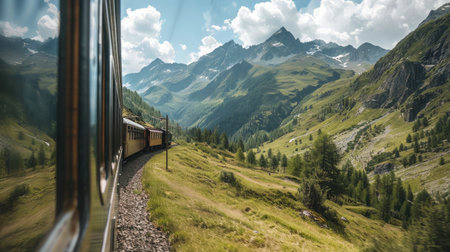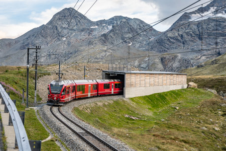 The Bernina railway winds through the breathtaking Swiss Alps near Bernina Pass, showcasing stunning mountain views and lush greenery in Graubunden.