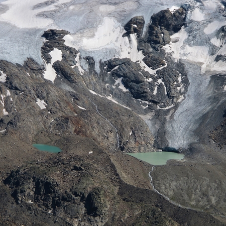 View from Mount Rothorn, Zermatt. Findel Glacier and small glacier lakes.