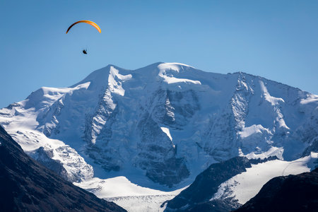 Paragliding above Bernina and Palu mountain range with glaciers in the Swiss Alps, Engadine, Switzerland